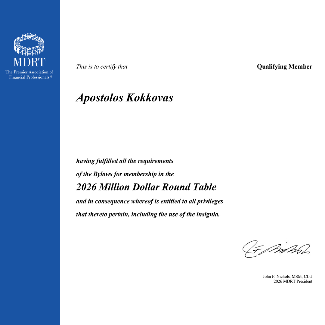 Το MDRT (Million Dollar Round Table) ή αλλιώς The Premier Association of Financial Professionals® ιδρύθηκε το 1927 και είναι μια παγκόσμια, ανεξάρτητη ένωση περισσότερων από 72.000 κορυφαίων επαγγελματιών στον τομέα των ασφαλειών ζωής και χρηματοοικονομικών υπηρεσιών, από περισσότερες από 500 εταιρείες, σε 70 έθνη και περιοχές . Τα μέλη του MDRT επιδεικνύουν εξαιρετικές επαγγελματικές γνώσεις, αυστηρή ηθική συμπεριφορά και εξαιρετική εξυπηρέτηση πελατών. Το να είναι κάποιος μέλος στο MDRT αναγνωρίζεται διεθνώς ως το πρότυπο αριστείας στον κλάδο των ασφαλειών ζωής και των χρηματοοικονομικών υπηρεσιών.